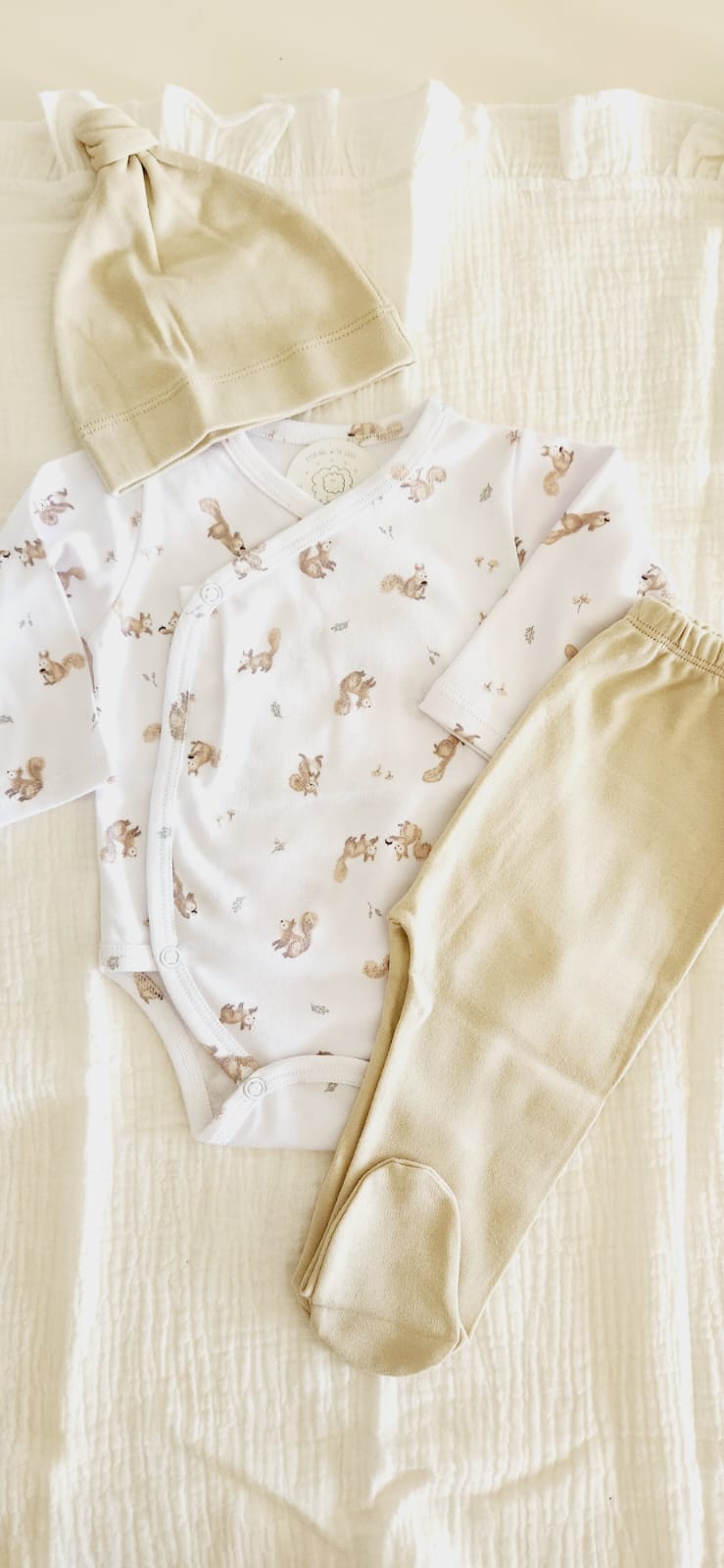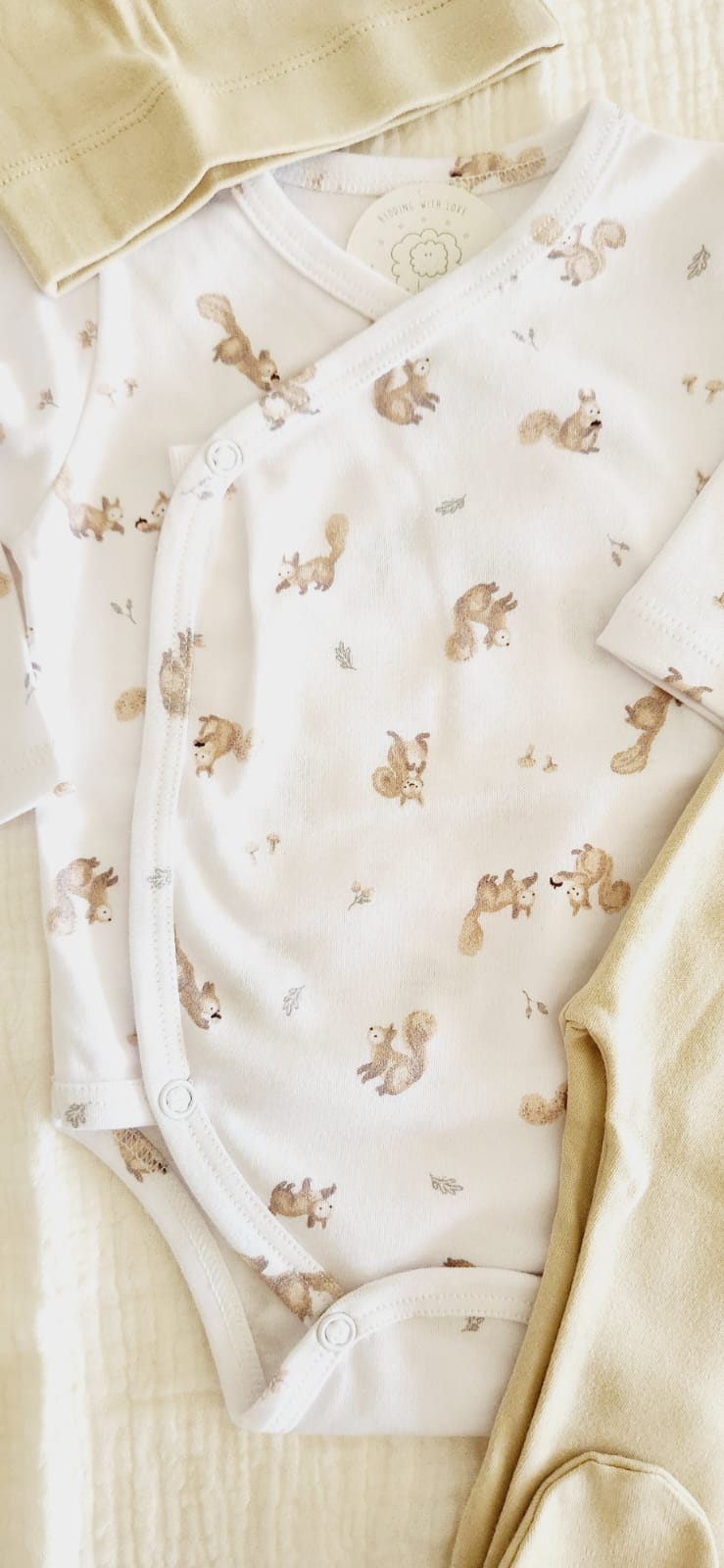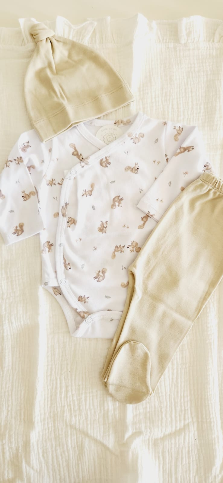 Conjunto Body cruzado, pelele y gorro Ardillas